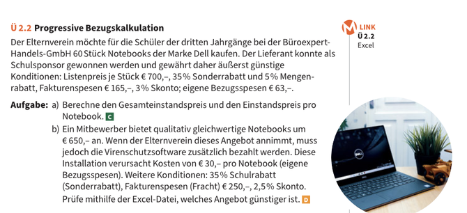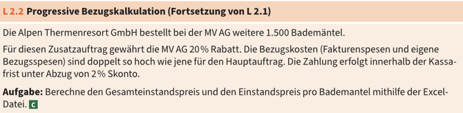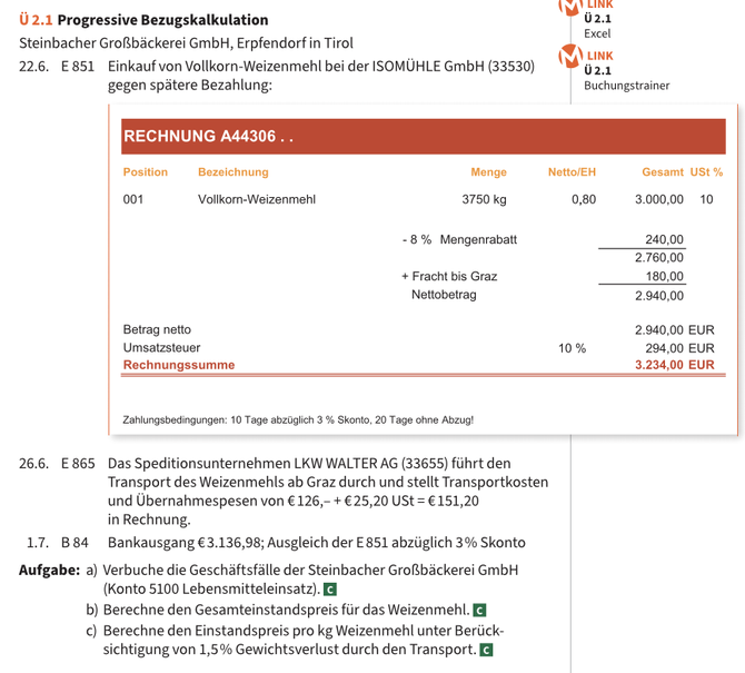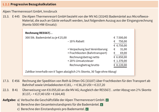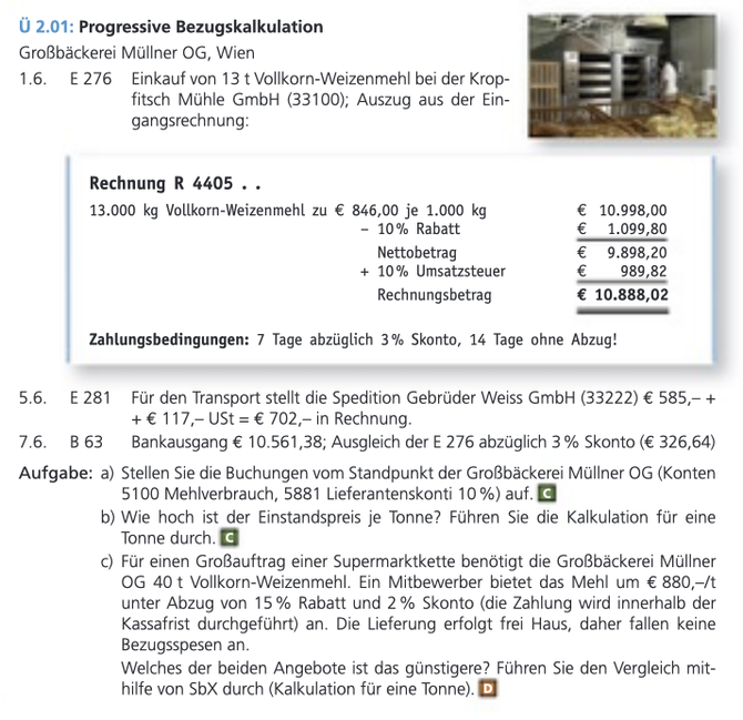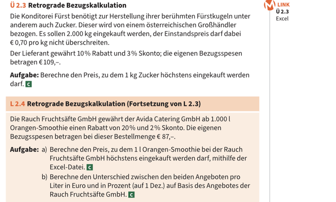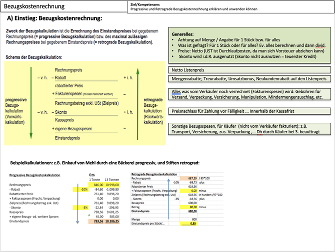 - Bezugskostenkalkulation (Rechnungspreis - Rabatte + Fakturenspesen - Skonto + eigene Bezugsspesen...)