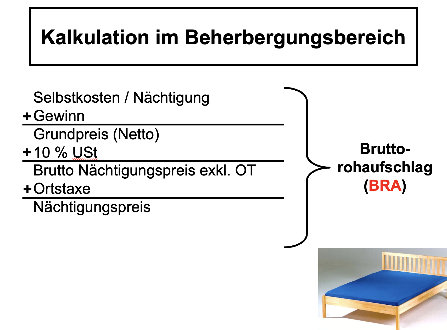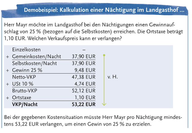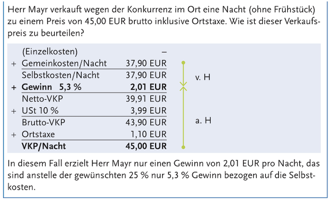 Der Gewinnzuschlag beträgt 40%, die USt auf Nächtigungen beträgt dzt. 10% und die Ortstaxe 1,10 EUR.