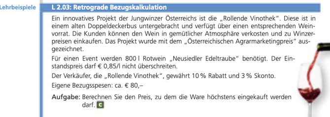 Herr Mayer kauft eine Flasche Zweigelt (0,7 Liter) bei einem Winzer im Mittelburgenland um 7,50 EUR netto ein.