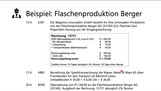15.3. Die Race Teck GmbH kauft Kunststoffgranulat bei der OMV AG: 3.000 kg zu 2,50 EUR netto je kg. Die OMV gewährt 10% Rabatt und 2% Skonto bei Zahlung innerhalb von 8 Tagen. Als Verpackungsspesen werden von der OMV 31,00 EUR und für Bahnfracht (bis Salzburg) 69,00 EUR verrechnet.