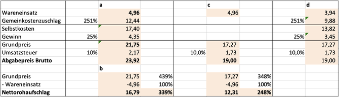 c) Wie verändert sich der Nettorohaufschlag, wenn das Schnitzel aus Konkurrenzgründen nur um 19,00 EUR inkl. USt verkauft werden kann?