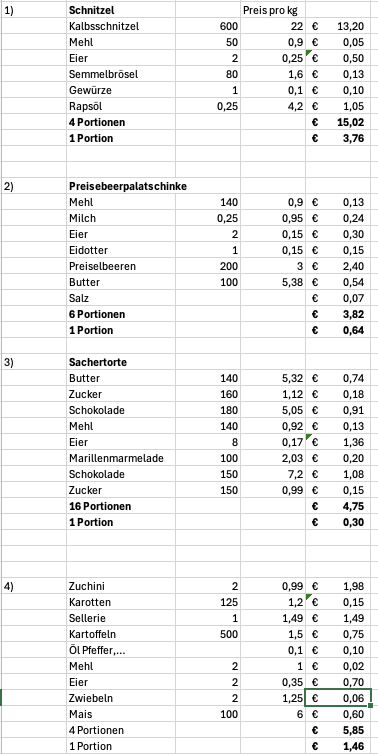 1) Ermitteln Sie den Wareneinsatz für 4 und für 1 Wiener Schnitzel