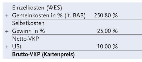 Der Gemeinkostenzuschlag laut BAB beträgt 251%. Es wird mit einem Gewinnzuschlag von 25% gerechnet.
