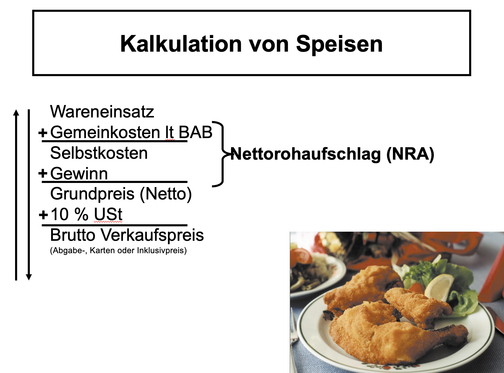 2) Ermitteln Sie den Brutto Verkaufspreis für 1 Wiener Schnitzel, wenn der Gemeinkostenzuschlag laut BAB 250,80% auf den Wareneinsatz beträgt, ein Gewinnzuschlag von 25% berücksichtigt werden soll und die gesetzliche Umsatzsteuer auf Speisen zur Anwendung kommt.